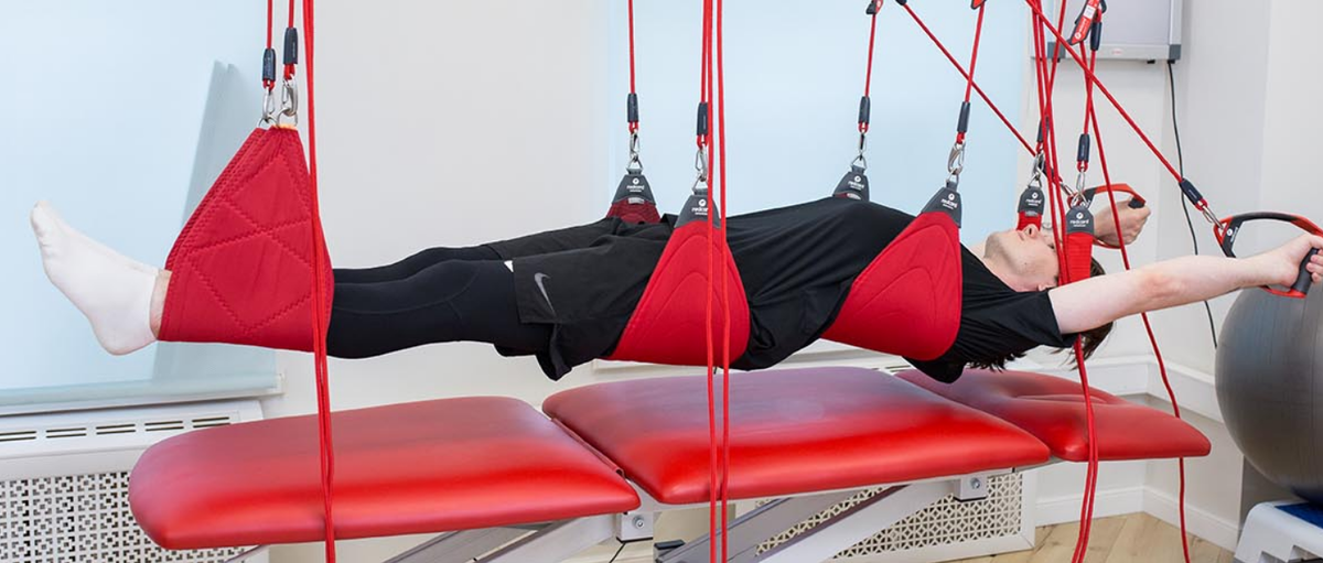 - "Отключаем" боль. Пациента помещают в систему подвесов. Тело полностью расслабляется, снимается осевая нагрузка с позвоночника и суставов. Это позволяет "выключить" поверхностные, спазмированные мышцы и избавиться от болевых ощущений во время занятия.